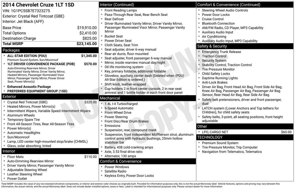 WOW CHECK THIS ONE OUT (Auto-Dimming Inside Rear-View Mirror, Driver 6-Way Power Seat Adjuster, Driver/Front Passenger Illuminated Vanity Mirrors, Outside Heated Power-Adjustable Body-Color Mirrors, and Remote Vehicle Starter System), All-Star Edition (Center Dash Auxiliary Glovebox Delete, Pioneer Premium 9-Speaker System, and Power Sliding Sunroof), Preferred Equipment Group 1SD, 16 5-Spoke Painted Aluminum Wheels, 6 Speaker Audio System Feature, 6 Speakers, ABS brakes, Air Conditioning, Alloy wheels, AM/FM radio: SiriusXM, AM/FM Stereo w/CD Player/MP3 Playback, Brake assist, Bumpers: body-color, Cargo Net, CD player, Compass, Delay-off headlights, Driver door bin, Driver vanity mirror, Dual front impact airbags, Dual front side impact airbags, Electronic Stability Control, Emergency communication system: OnStar Directions & Connections, Front & Rear All-Weather Floor Mats, Front anti-roll bar, Front Bucket Seats, Front Center Armrest, Front reading lights, Front wheel independent suspension, Fully automatic headlights, Illuminated entry, Knee airbag, Leather Shift Knob, Low tire pressure warning, Occupant sensing airbag, Outside temperature display, Overhead airbag, Panic alarm, Passenger door bin, Passenger vanity mirror, Power door mirrors, Power steering, Power windows, Premium Cloth Seat Trim, Radio data system, Rear seat center armrest, Rear side impact airbag, Rear window defroster, Remote keyless entry, Security system, SiriusXM Satellite Radio, Speed control, Speed-sensing steering, Split folding rear seat, Steering wheel mounted audio controls, Tachometer, Telescoping steering wheel, Tilt steering wheel, Traction control, Trip computer, Variably intermittent wipers, and Voltmeter. Whether you are looking to get into a brand new or pre-owned vehicle, we can customize everything to fit into your budget and make it affordable for you. We specialize in financing. If you have perfect credit or are looking to establish or rebuild your credit, we will help you find the best financing rates possible. We have even have first time buyer programs! Even if this is you first vehicle, you can trust our team at Fosterâs to help you find the perfect vehicle to fit your needs. We look forward to working with you!