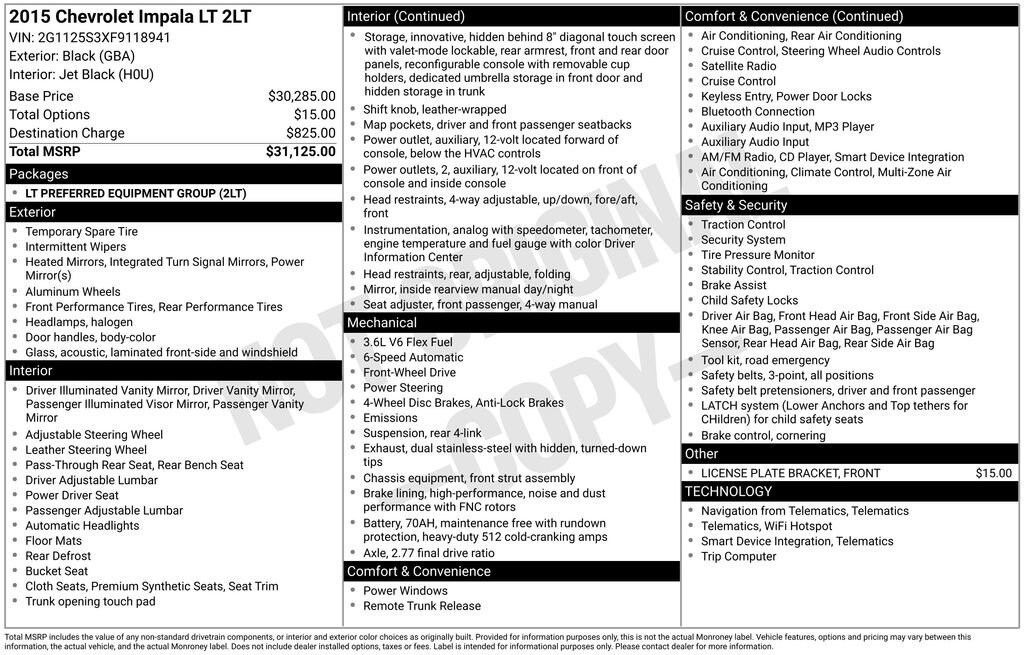 Check out all these great option's Preferred Equipment Group 2LT, 100-Watt 6-Speaker System, 18 Painted Alloy Wheels, 3 USB Ports, 4-Way Manual Front Passenger Seat Adjuster, 4-Wheel Disc Brakes, 6 Speakers, 8-Way Power Driver Seat Adjuster, 8 Diagonal Color Infotainment Display, ABS brakes, Air Conditioning, Alloy wheels, AM/FM radio: SiriusXM, Automatic temperature control, Brake assist, Bumpers: body-color, CD player, Compass, Delay-off headlights, Driver door bin, Driver Power Lumbar Seat Adjuster, Driver vanity mirror, Dual front impact airbags, Dual front side impact airbags, Electronic Stability Control, Emergency communication system: OnStar Directions & Connections, Four wheel independent suspension, Front anti-roll bar, Front Bucket Seats, Front Center Armrest, Front dual zone A/C, Front License Plate Bracket, Front Passenger Power Lumbar Seat Adjuster, Front reading lights, Fully automatic headlights, Heated door mirrors, Illuminated entry, Knee airbag, Leather Shift Knob, Low tire pressure warning, Occupant sensing airbag, Overhead airbag, Overhead console, Panic alarm, Passenger door bin, Passenger vanity mirror, Power door mirrors, Power driver seat, Power steering, Power windows, Premium audio system: Chevrolet MyLink, Premium Cloth/Leatherette Seat Trim, Radio data system, Radio: Chevrolet MyLink AM/FM Stereo w/CD Player, Rear anti-roll bar, Rear reading lights, Rear seat center armrest, Rear side impact airbag, Rear window defroster, Remote keyless entry, SD Card Receptacle, Security system, SiriusXM Satellite Radio, Speed control, Speed-sensing steering, Split folding rear seat, Steering wheel mounted audio controls, Tachometer, Telescoping steering wheel, Tilt steering wheel, Traction control, Trip computer, Turn signal indicator mirrors, and Variably intermittent wipers. Whether you are looking to get into a brand new or pre-owned vehicle, we can customize everything to fit into your budget and make it affordable for you. We specialize in financing. If you have perfect credit or are looking to establish or rebuild your credit, we will help you find the best financing rates possible. We have even have first time buyer programs! Even if this is you first vehicle, you can trust our team at Fosterâs to help you find the perfect vehicle to fit your needs. We look forward to working with you!CARFAX One-Owner. 2LTAwards:* JD Power Automotive Performance, Execution and Layout (APEAL) Study, JD Power Initial Quality Study * 2015 KBB.com 10 Most Awarded Cars * 2015 KBB.com 10 Most Comfortable Cars Under $30,000 * 2015 KBB.com 5-Year Cost to Own Awards * 2015 KBB.com 15 Best Family Cars * 2015 KBB.com Best Buy AwardsReviews:* If youâre looking for a big, comfortable 5-passenger family sedan with style, technology and value, the 2015 Chevy Impala should top your list. If you want to enjoy the lower prices and cleaner emissions of natural gas, the Impala is now among the few vehicles factory-fitted to run on it. Source: KBB.com* Serene and quiet ride; sleek, feature-rich cabin; big backseat and trunk; excellent crash test scores. Source: EdmundsPlease call (888) 476-6169 if you have any questions!
