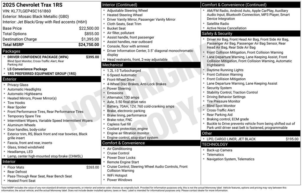 Check out all these great option's Driver Confidence Package (Lane Change Alert with Side Blind Zone Alert, Rear Cross-Traffic Alert, and Rear Park Assist), Preferred Equipment Group 1RS, 2-Way Adjustable Front Head Restraints, 3.50 Final Drive Axle Ratio, 4 Speakers, 4-Speaker Audio System Feature, 4-Way Manual Front Passenger Seat Adjuster, 4-Wheel Disc Brakes, 6-Way Manual Driver Seat Adjuster, ABS brakes, Air Conditioning, Alloy wheels, AM/FM radio: SiriusXM, Auto High-beam Headlights, Brake assist, Bumpers: body-color, Cloth Seat Trim, Compass, Delay-off headlights, Driver door bin, Driver vanity mirror, Dual front impact airbags, Dual front side impact airbags, Electronic Stability Control, Emergency communication system: OnStar One Essentials, Exterior Parking Camera Rear, Front and Rear All-Weather Floor Liners, Front anti-roll bar, Front Bucket Seats, Front Center Armrest, Front reading lights, Front wheel independent suspension, Fully automatic headlights, Heated door mirrors, Heated Driver and Front Passenger Seats, Heated front seats, Heated steering wheel, Illuminated entry, Jet Black Cargo Liner, Leather steering wheel, Low tire pressure warning, Occupant sensing airbag, Outside temperature display, Overhead airbag, Overhead console, Panic alarm, Passenger door bin, Passenger vanity mirror, Power door mirrors, Power steering, Power windows, Premium audio system: Chevrolet Infotainment 3, Radio data system, Radio: Chevrolet Infotainment 3 System with AM/FM, Rear window defroster, Rear window wiper, Remote keyless entry, Security system, SiriusXM Trial Subscription, Speed control, Split folding rear seat, Spoiler, Sport steering wheel, Steering wheel mounted audio controls, Tachometer, Telescoping steering wheel, Tilt steering wheel, Traction control, Trip computer, Variably intermittent wipers, and Wheels: 18 Black-Painted Machined Aluminum. Whether you are looking to get into a brand new or pre-owned vehicle, we can customize everything to fit into your budget and make it affordable for you. We specialize in financing. If you have perfect credit or are looking to establish or rebuild your credit, we will help you find the best financing rates possible. We have even have first time buyer programs! Even if this is you first vehicle, you can trust our team at Fosterâs to help you find the perfect vehicle to fit your needs. We look forward to working with you!